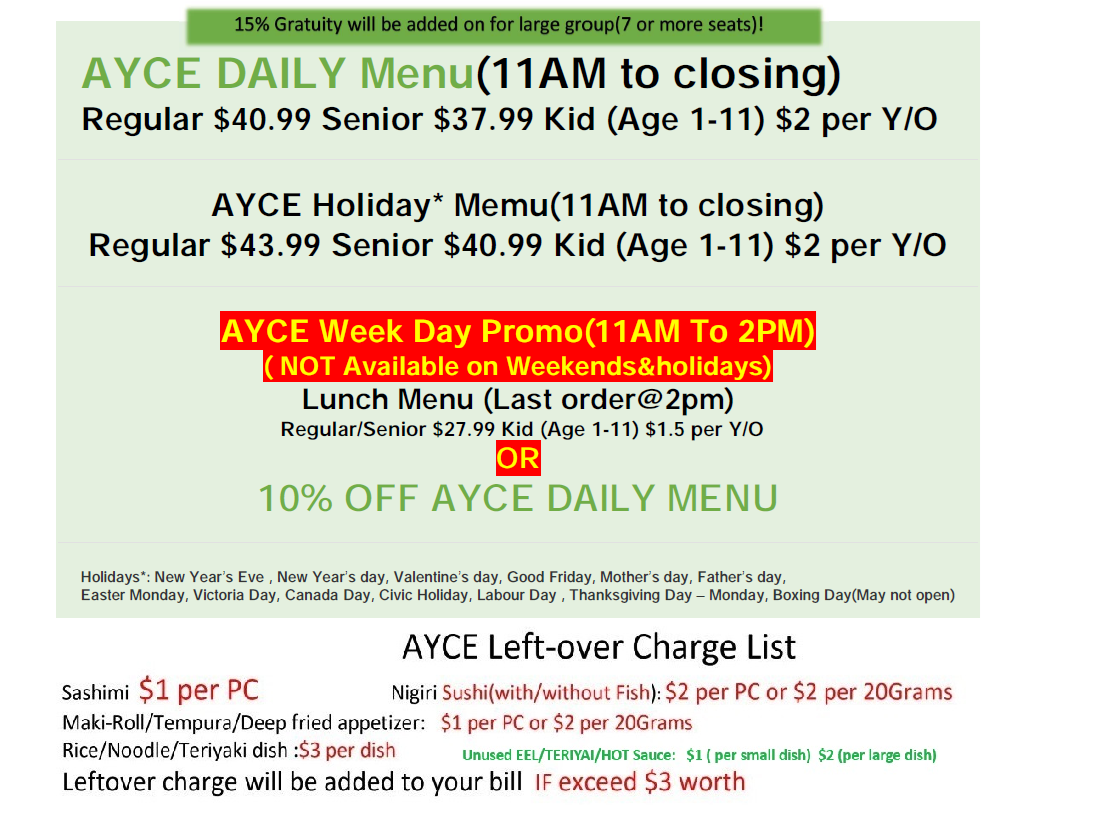 AYCE Week Day Lunch Menu(11AM To 2PM)(Last Order@ 2pm. NOT Available on holidays)Regular/Senior $26.99Kid (Age 1-11) $1.5 per Y/OAGE PROOF NEEDED FOR big & tall kid |