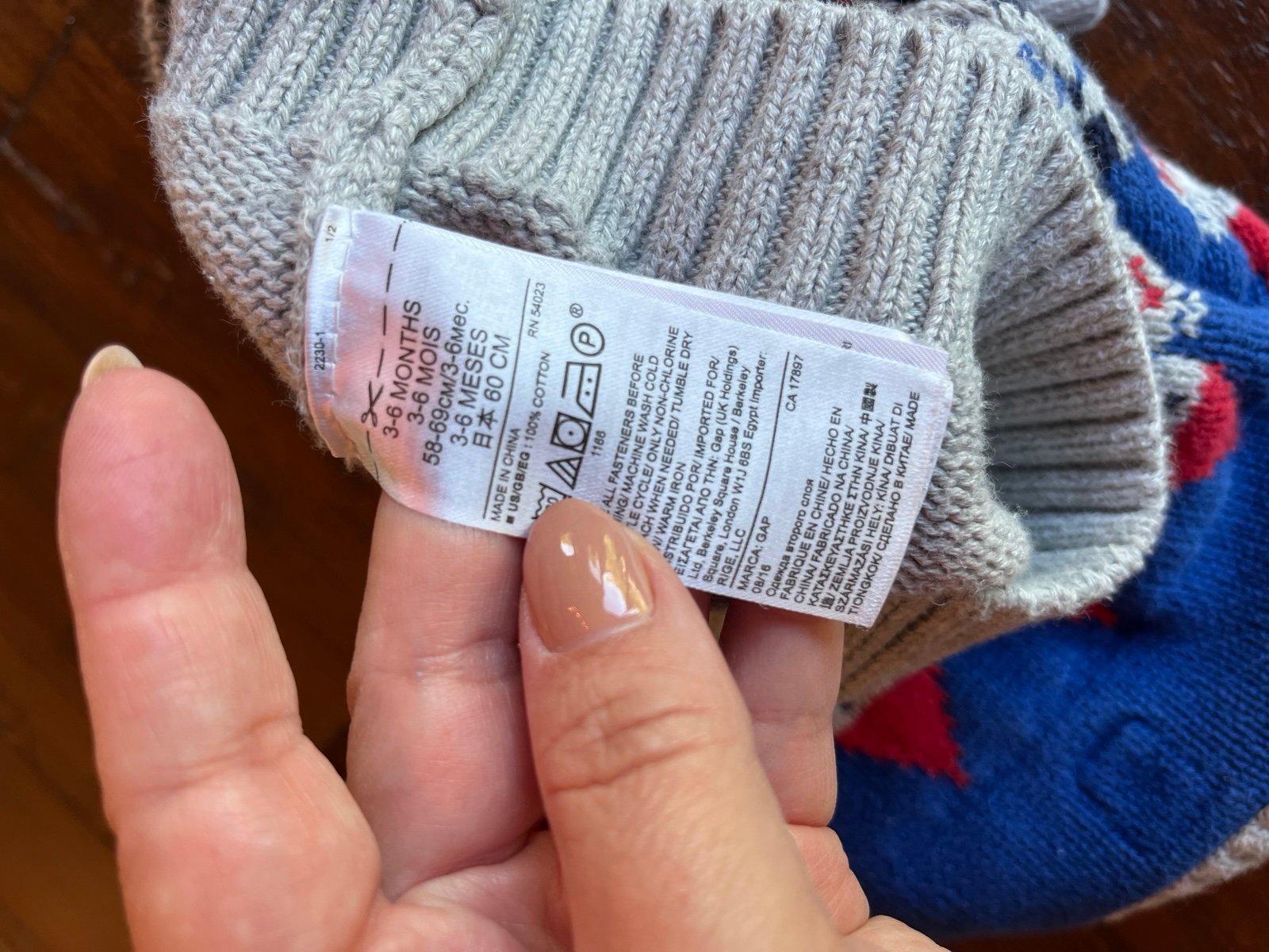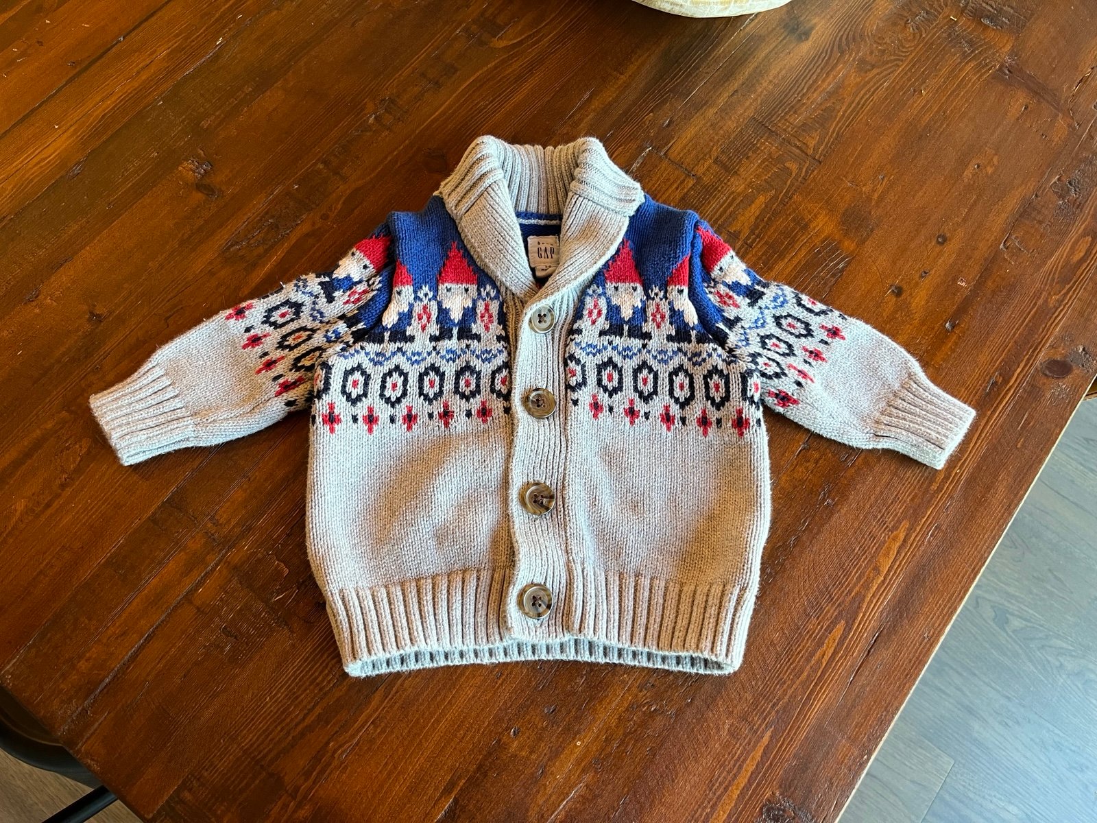 Baby Gap Fair Isle "Gnome" Winter Cardigan. The sweater is a gray, fair isle knit with red and blue accents, a shawl collar, and buttons down the front. Sweater is 3-6 months.