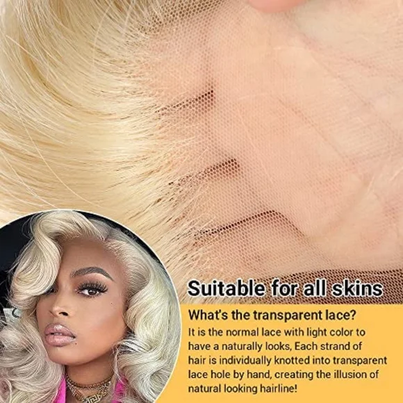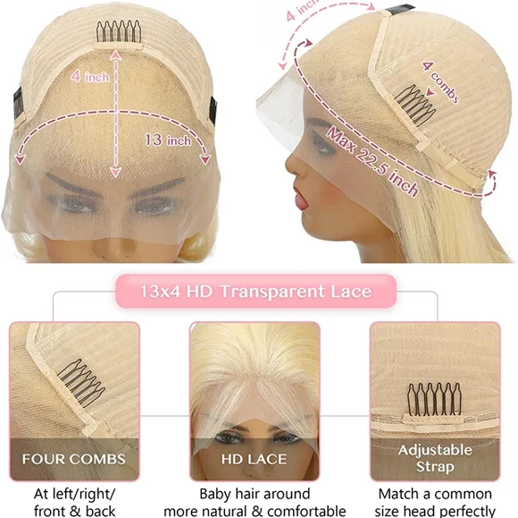 613 13x4 HD Lace Front Wig Human Hair.Material: 10A Brazilian Virgin Human Hair.Lace Size: 13x4 HD Lace.Cap Construction: Lace Front with Adjustable Straps and Combs.Hair Length: 22 Inch.Hair Texture: Body Wave Lace Front Wigs Human Hair.Density: 150% Densities.Color: Blonde Lace Front Wigs Human Hair.Features:Natural-looking 13x4 inch lace front for versatile styling options, can make your favorite hairstyle, straight hair, deep wave.Soft and smooth 100% human hair that can be styled just like your hair Comfortable fit with adjustable straps and combs for a secure hold Individually hand-tied hairs for a more realistic and natural look.Note: This wig is made of 100% human hair and requires proper care and maintenance to extend its lifespan.