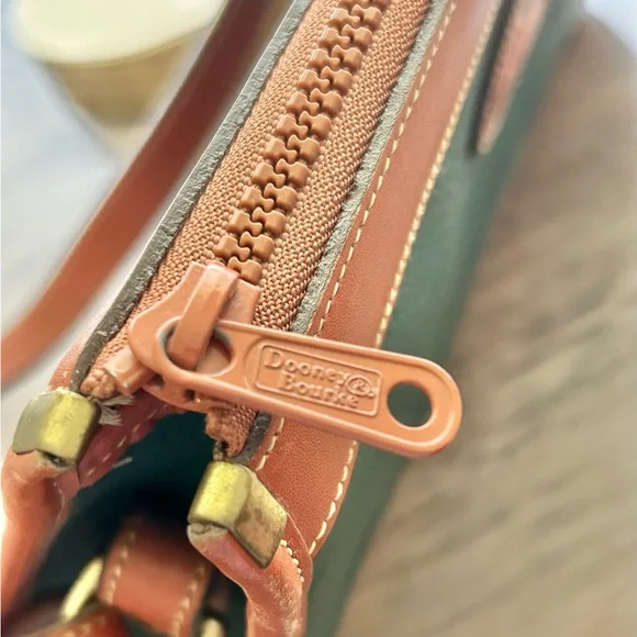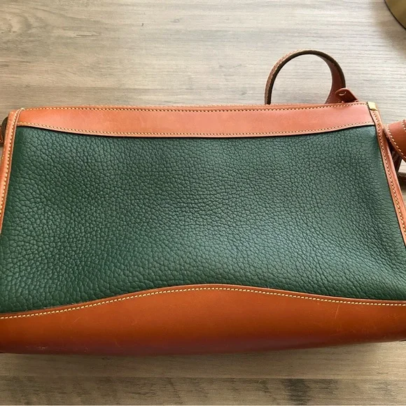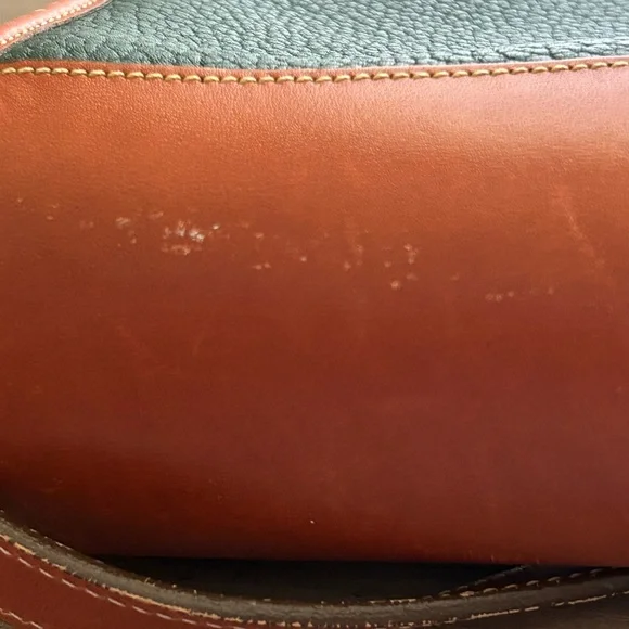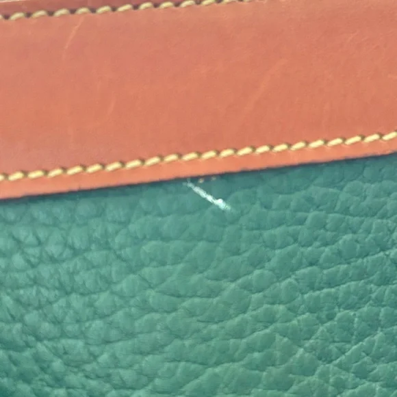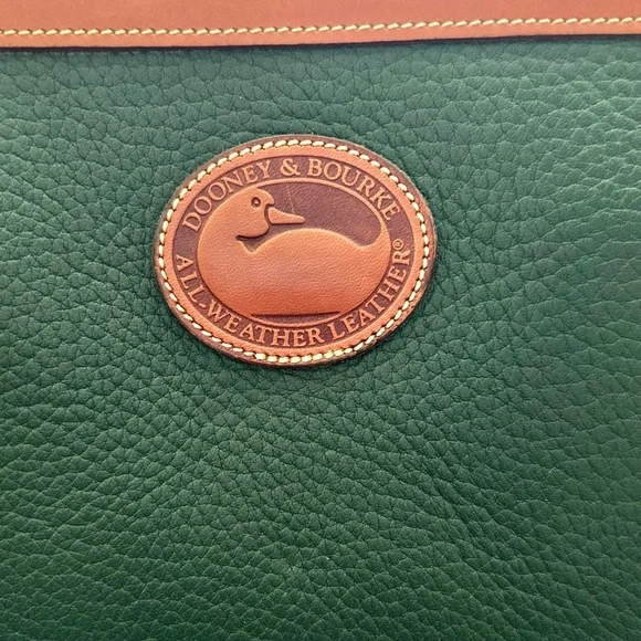Stylish Dooney & Bourke All Weather Leather crossbody bag. Rich brown and dark green pebbled leather with detailed stitching. Perfect for everyday use.PLEASE READ:There is no hangtag on this handbag. It was thrifted without one and I’m not sure if Dooney released it with one. This bag is in great thrifted condition. There are several areas where there as scratches, normal wear. Please see photos. Inside is clean-no rips, tears or stains! Adjustable crossbody length strap. If you have any questions, please feel free to ask!
