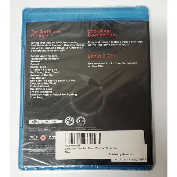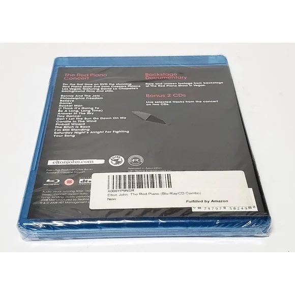 The product is a Blu-Ray documentary film titled "Elton John The Red Piano Concert", featuring the iconic rock and pop artist Elton John. This sealed new item offers fans a rare and intimate look at one of the world's greatest musical talents live on stage, showcasing his talent and charisma in a visually stunning setting. Perfect for music enthusiasts and collectors alike, this documentary allows viewers to experience Elton John's legendary performances in high-definition quality.Elton John The Red Piano Concert Backstage Documentary about 2 CDsSealed DVD Blu-Ray CD ComboPhotos are part of the detailed description. Please message me if you have any questions about the item posted.Items are shipped quickly from clean, smoke free- pet free environment.I am willing to combine items to save on shipping for you as well!Please consider adding me to your favorite seller list as I add new items consistently!Feedback for your purchase is greatly appreciated, and I will do the same for you.Thank you kindly for your purchase!