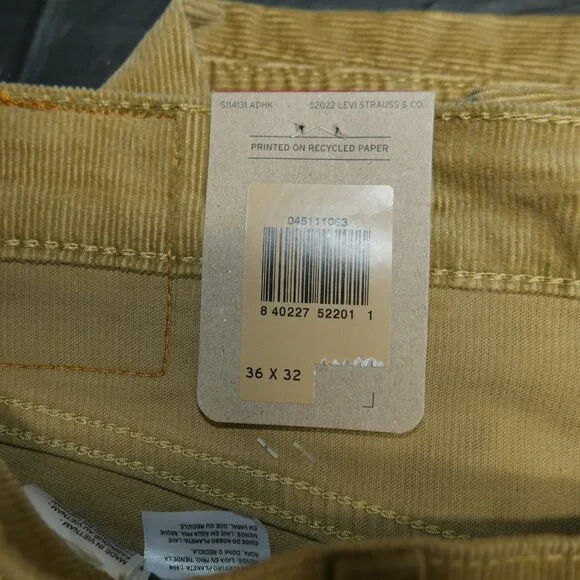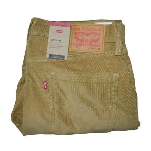 Levis 511 Slim Fit Corduroy Jeans Men's Size 36x32 Stretch Harvest Gold BeigeDesigned to fit like they've been tailored just for you, these Levi's® corduroy pants are narrow through the thigh, but not narrow enough to keep you from running for the bus or dancing on the rooftop.Two front pockets; coin pocket; two back pocketsStretch fabricSits Below the WaistSlim FitZip fly with button closureCotton/polyester/elastaneMeasures True To Tag Size!New With Tags! No Flaws/Odors.Actual Color May Vary Slightly In Person Due To Lighting And/Or Screen Brightness Of Computer Or Mobile Device. We Offer Combined Shipping!