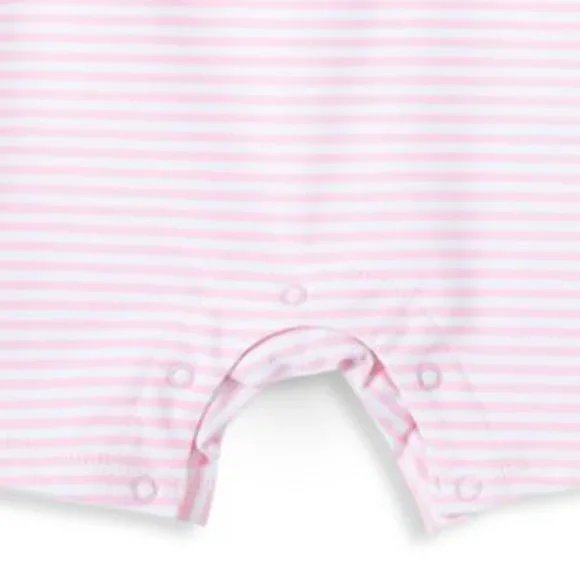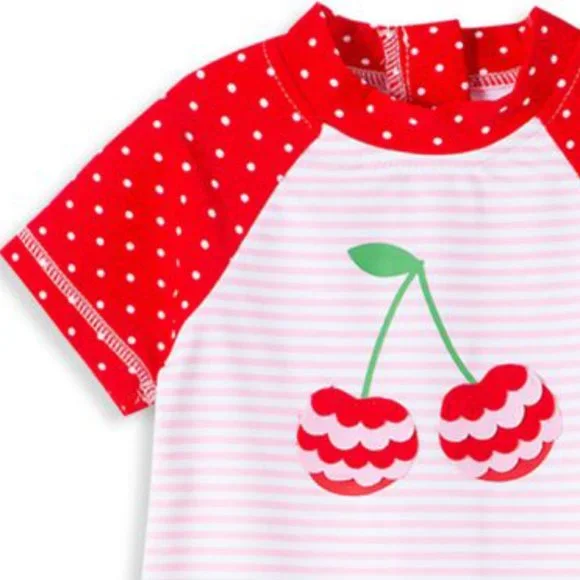 Complete with UPF 50+Rashguard swimwear Nylon/spandexLinedShort raglan sleeveBack zip closureInseam snap button closureFruit/cherry layered scalloped appliqué at frontPolka dotted bodice and sleeves - red, white tintAllover stripe pattern base - white, pastel/light pink hueImportedMachine washProduct listings may have inaccuracies. Please send a message for any product inquiries.