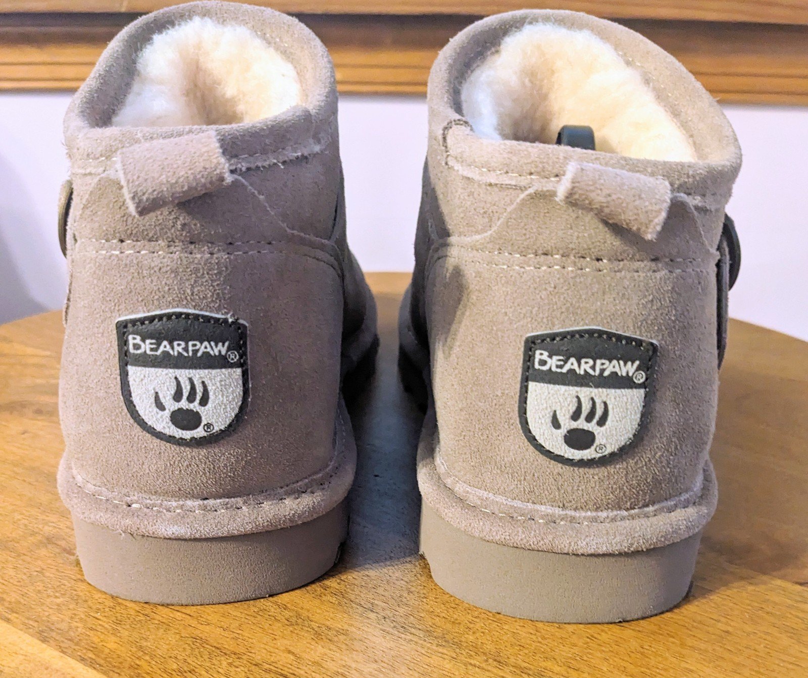 The Bearpaw Women's Size 8 Petite Slip On Ankle Winter Suede Boots in Mushroom are perfect for the winter and fall seasons. These ankle boots feature a slip-on style with a round toe and a wool blend lining for comfort. The suede upper material and rubber outsole provide durability, while the adjustable ankle strap ensures a secure fit. The flat heel makes them ideal for casual occasions, and the solid color adds a versatile touch to any outfit.