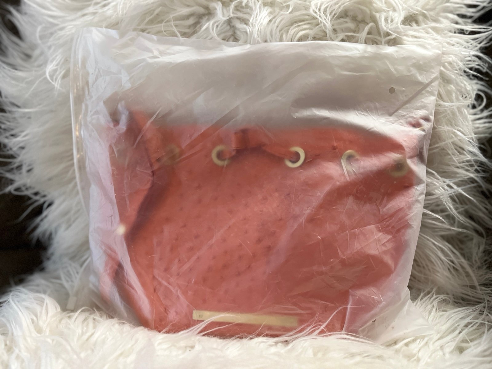 This stunning Brahmin bucket bag and matching wallet set comes in a bold tangerine orange ostrich-embossed leather. The bag includes its Certified Authenticity paperwork and Brahmin dust bag — confirming its verified authenticity through Authenticate First. Both pieces feature gold-tone hardware and premium craftsmanship typical of Brahmin’s high-quality leather goods.