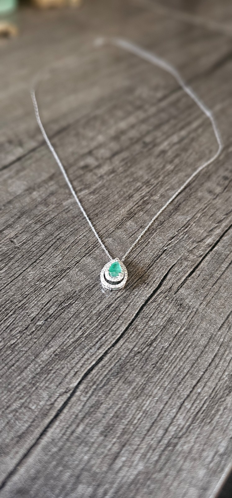 This elegant 14k white gold necklace features a pear-shaped emerald secured in a three-prong setting in the center. Two concentric halos of round brilliant cut diamonds add elegance. A Singapore chain accompanies this pendant.