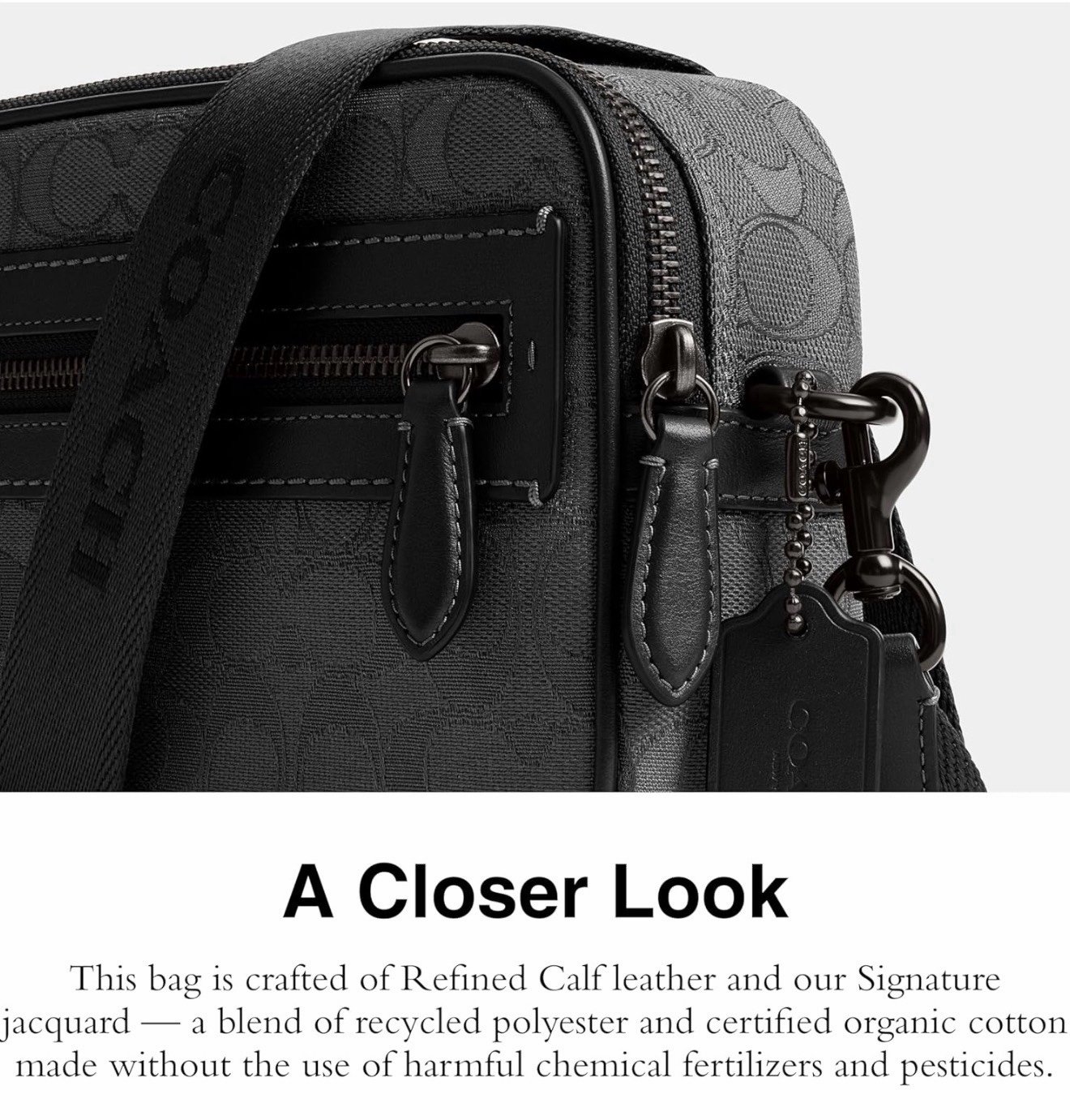 Our Signature Jacquard is made with a blend of 46% recycled polyester and 54% regenerative cotton sourced from farms that use regenerative agricultural practices—those that help to maintain and rejuvenate land, increase biological diversity and soil health, and could lead to increased carbon absorption. It reflects our ongoing commitment to helping reduce our impact on the planet.” -Coach