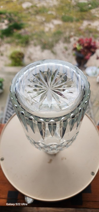 I've looked and looked and can't find the same, only similarities. It's very attractive and not over done. It displays some criss cross cuts with lines going midway thru. There is a pinwheel on bottom and a pinwheel on the stopper. The stopper isn't flat but as some describe as mushroom stopper. The glass is clear. Someone know who the maker is? Stands 10.25" x 4" wide. Is roughly around 3lbs. Due to the shape I'd say its more of a whiskey decanter. Vintage.