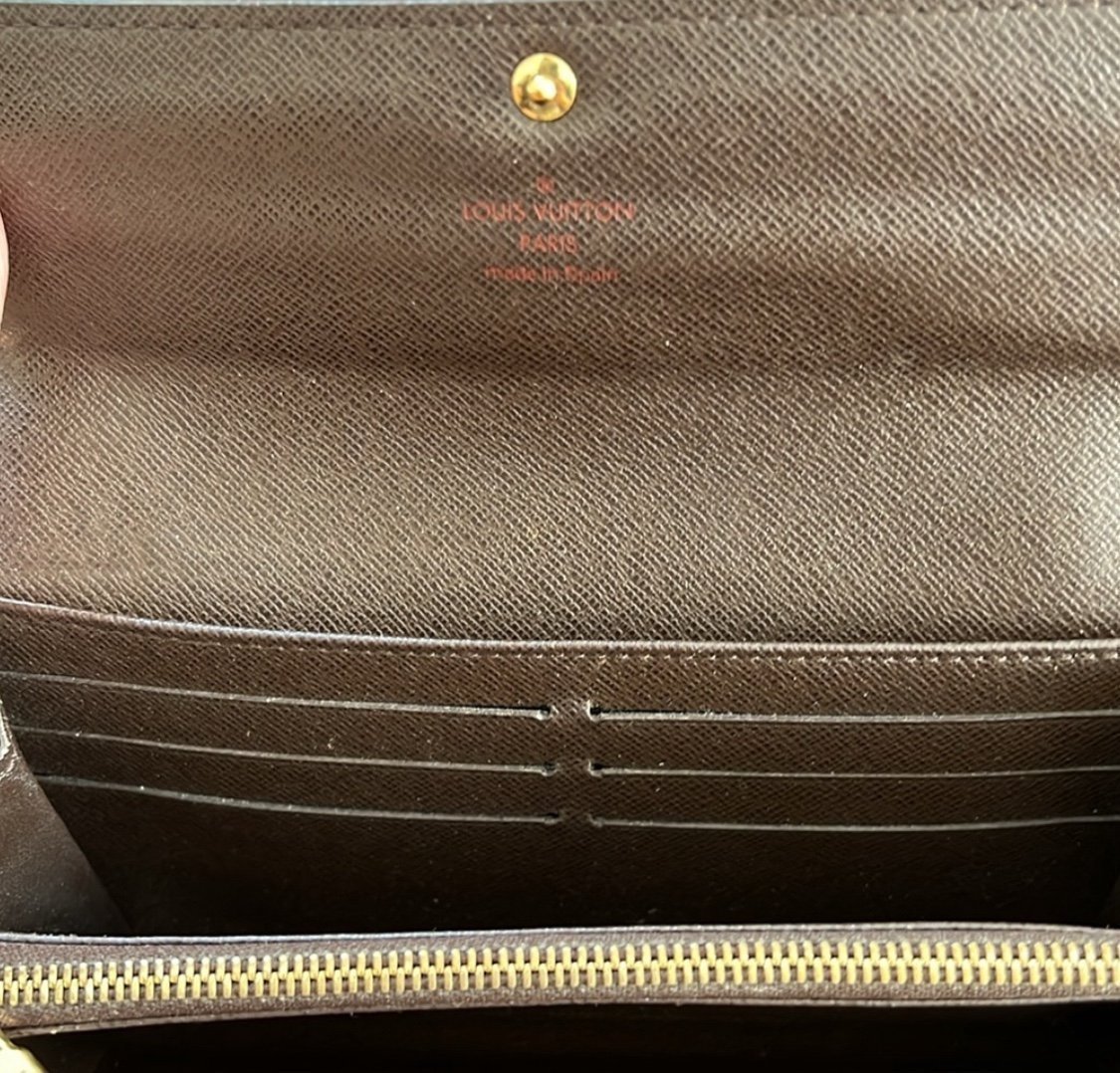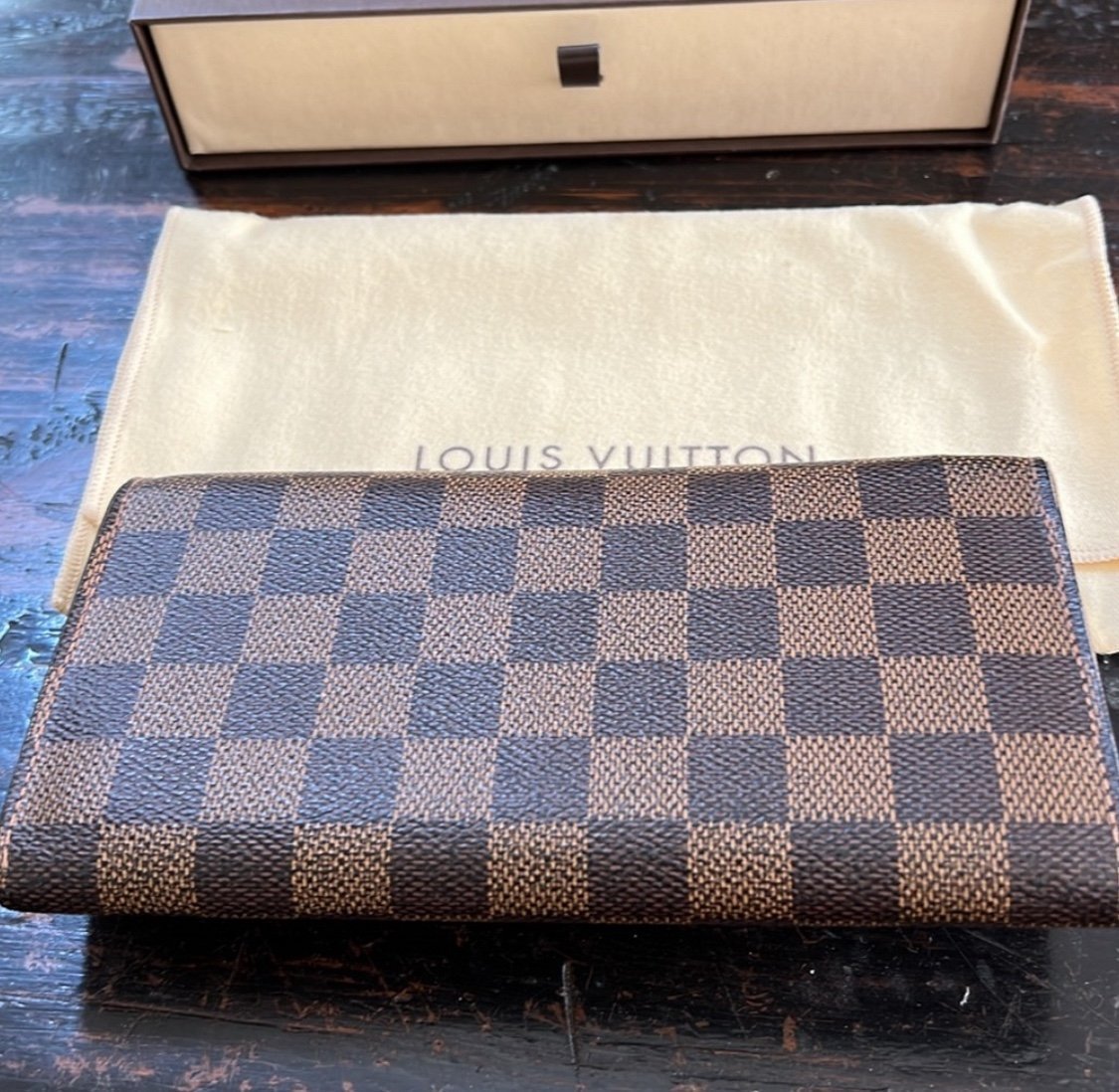Louis Vuitton Damier Ebene Sara wallet. Hardwares are still shiny, zipper works well, canvas is good with no scuff or tear. Coin slot is darkening due to usage but inside is clean. Creases on the flap cover as shown on the picture. It features compartment bills, 10 credit card slots and coin compartment. It comes with box and dust bag. Can be a very nice gift.