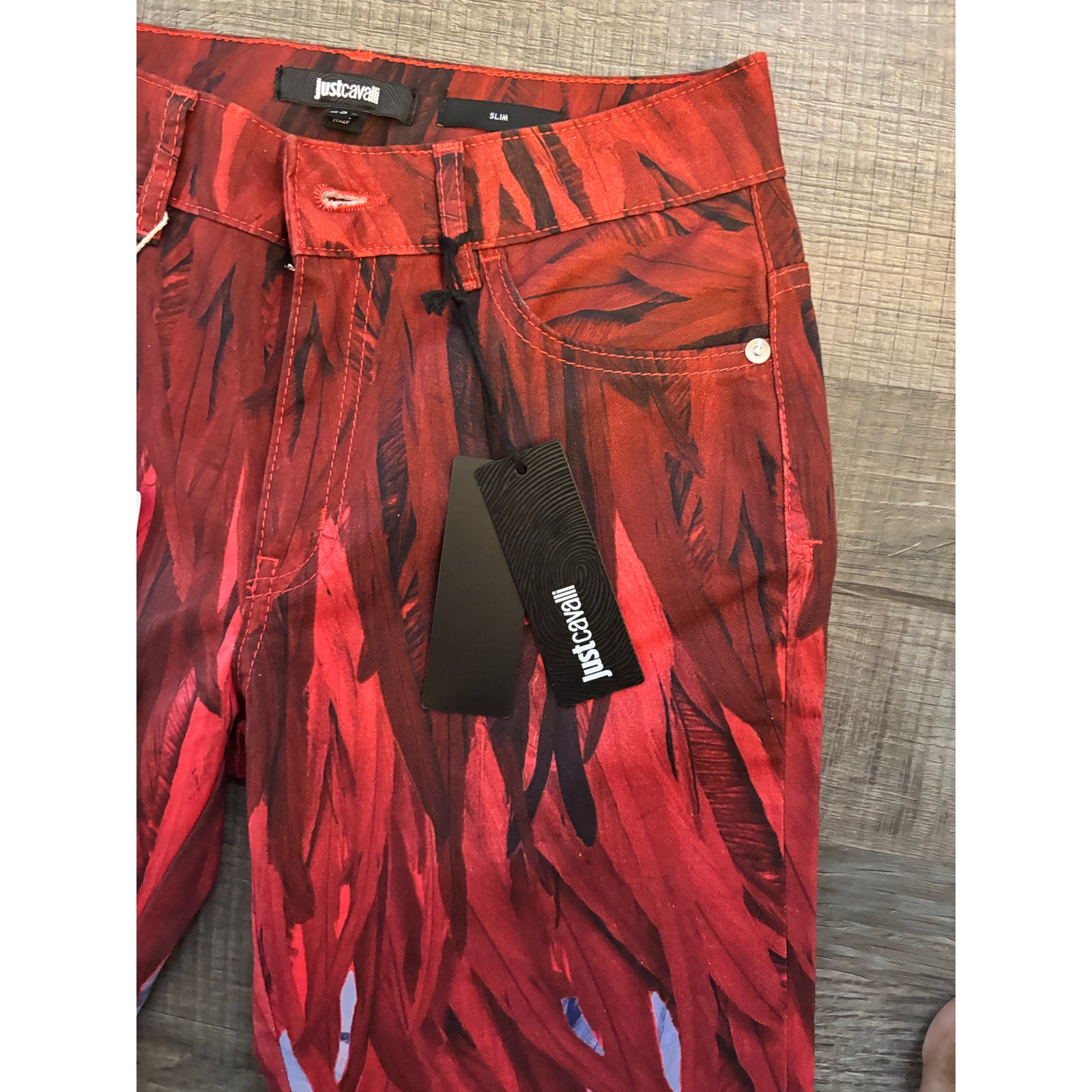 Just Cavalli Skinny Leg Jeans, a striking fusion of editorial luxury and fearless street style. These designer jeans feature a bold feather-inspired red and purple print cascading into a fierce black-and-white leopard pattern, embodying the signature Cavalli flair for dramatic detail and statement-making design.