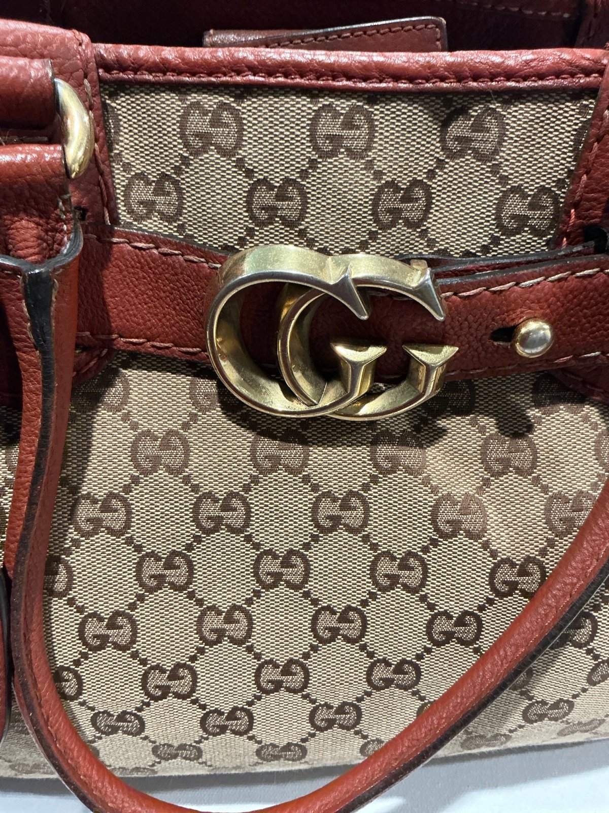 Pre-Owned Vintage Gucci GG Monogram Canvas Running Tote with large GG and Luggage Tag. Goldtone hardware has some degree of tarnishing. GG Belt around the front is adjustable. Snaps on both sides to allow for expansion of the bag. Luggage Tag has Gucci imprinted in the leather. Orange leather Trim on the bag shows signs of use but there is no cracks or tears. Inside is clean and fully lined, has a large zipper pocket with two Slip pockets. Five footers on the bottom shows signs of tarnishing. This beautiful bag is looking for a Gucci Collector. Please review all photos before purchasing.