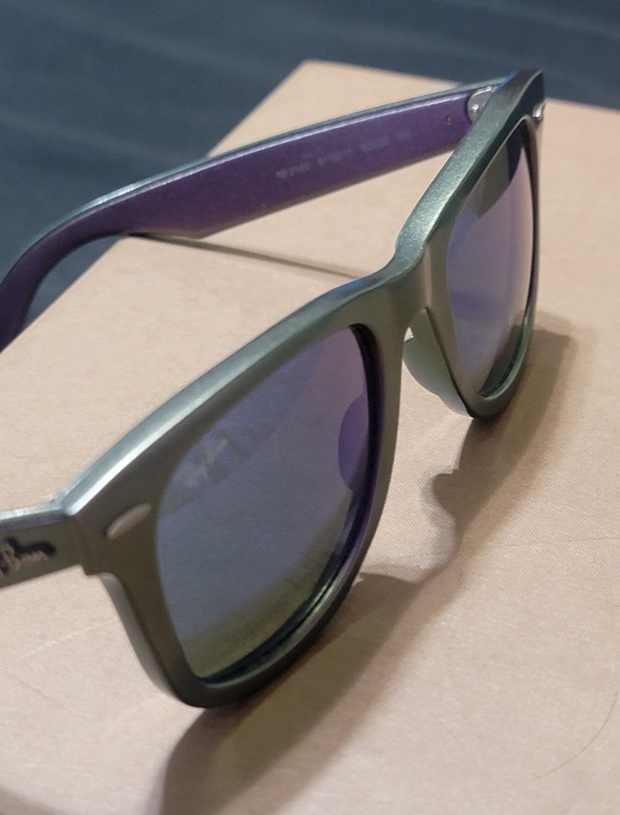 Original Wayfarer Cosmo RB2140 6112/17 crafted from the traditional Wayfarer frame, but finished with shifting colors that flow mysteriously into one another, giving it an effect never before seen. A Violet hue shifts to metallic green and colors in-between depending on the clothes you're wearing or how the sunlight reflects off them.