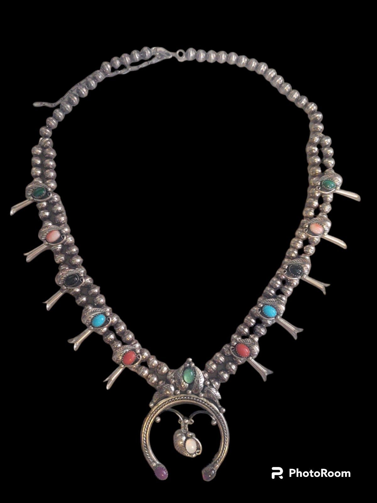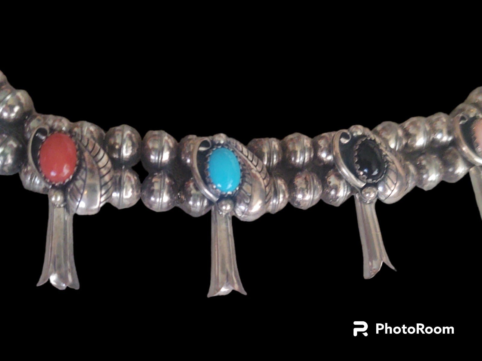 This gorgeous necklace, from circa the 70's, is quite the statement piece still today. It represents all the talent, style, and craftsmanship of the silversmiths of the Southwest.