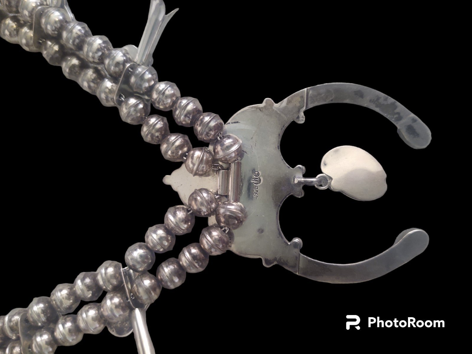 Beautiful American West, Navajo Squash Blossom necklace, double strand in sterling silver balls with cabochons set in sawtooth bezels, accented with silver stylized leaves and silver blossoms.